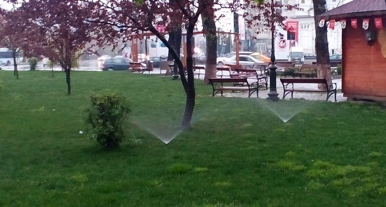 Desi ploua de o zi si o noapte, gazonul din Parcul Trandafirilor din Bacau este irigat cu apa de la sistemul public. Probabil unghiul de incidenta si viteza picaturilor de ploaie nu sunt conforme cu normativele care trebuie respectate de municipalitatea bacauana…