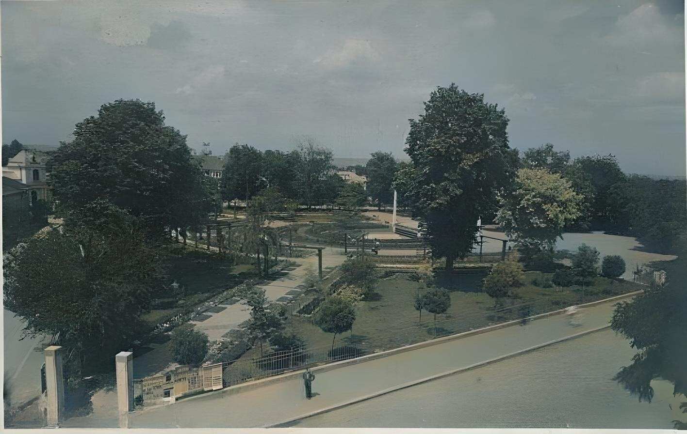 Această imagine colorizată surprinde o privire rară asupra centrului Bacăului de altădată, înfățișând fosta Grădină Publică, ce este cunoscută astăzi drept Parcul Trandafirilor. Această locație emblematică a orașului a suferit numeroase transformări de-a lungul anilor, păstrând totuși o parte din structura sa originală și elementele distinctive care o definesc.