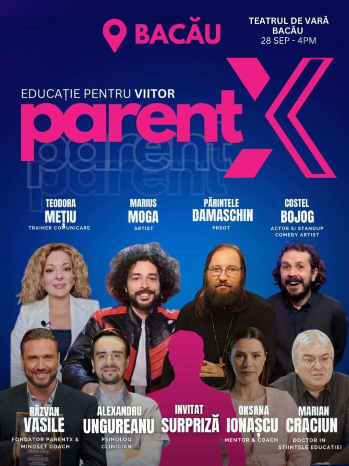 PARENTX aduce pe scenă educației o echipă de speakeri excepționali, incluzând celebrități din domeniul educației și dezvoltării personale, experți în psihologie, medicină, neuroștiințe, precum și personalități cu un impact social puternic. La evenimentul de la BACĂU vor fi prezenți: