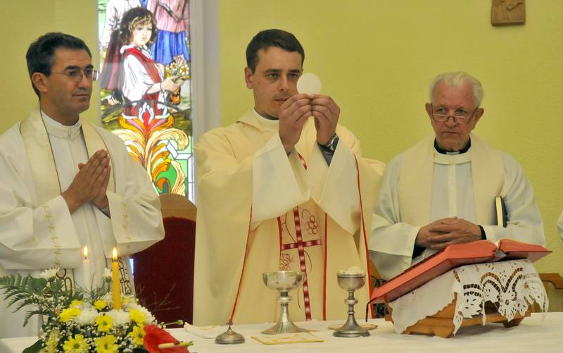 Inconjurat de 12 confrati, printre care preotul-decan Isidor Dâsca, pr.paroh Andrei Cocianga si preotul Mihai Budau, econom diecezan si presedinte al Asociatiei „Casa de copii Sfânta Maria”, parintele Cosmin a oficiat pentru prima data Sfânta Euharistie. Cu un usor tremur in glas, acesta a invocat Sfântul Duh, fiind urmarit cu smerenie de cei prezenti. La finalul Liturghiei, copiii l-au felicitat in felul lor, prin versuri, cântece si flori.
