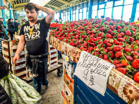Spanacul e la 6 lei kilogramul și nu poți să nu te uiți și pe alături: cartofi noi 4,5 – 5 lei kilogramul sau roșii românești (cel puțin așa scrie pe carton-n.r.) la 17 lei kilogramul. Piața e plină și de fructe, iar pe lângă cele autohtone, trenează pe tarabe și pepeni tăiați felii sau citrice sau fructe exotice. Și nu poți să treci nepăsător pe lângă căpșunele frumos parfumate care sunt la doar 9 lei kilogramul.