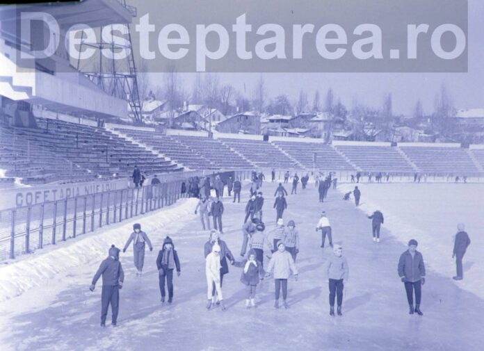 Pe gheața improvizată a stadionului, copiii de toate vârstele patinează cu entuziasm. Ținutele simple – căciuli tricotate, paltoane groase și mănuși – completează atmosfera iernii autentice. Pentru cei din generațiile care au trăit acea perioadă, această imagine evocă nu doar amintiri ale unor vremuri mai simple, dar și sentimentul de comunitate și ingeniozitate, când spațiile publice erau adaptate pentru nevoile orașului.