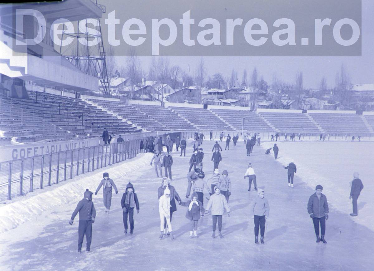 Într-o imagine ce ne transportă direct în anii ’70, vedem un peisaj de iarnă plin de farmec, surprins pe Stadionul „23 August” din Bacău. Atunci, în lipsa unor facilități dedicate sporturilor de iarnă, pista de atletism a stadionului devenea, în mod ingenios, un patinoar improvizat pentru localnici. Tineri și copii deopotrivă se bucurau de o iarnă autentică, făcând din stadion un adevărat loc de întâlnire și distracție comunitară.