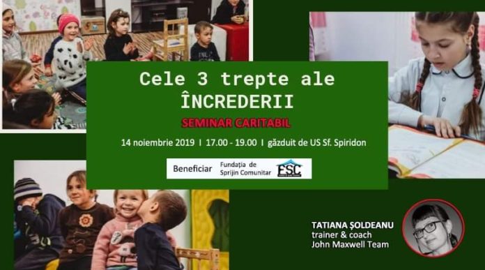 Fundația de Sprijin Comunitar (FSC) îi așteaptă pe băcăuani, joi, 14 noiembrie, de la ora 17, la Universul Sănătății Sf. Spiridon, care va găzdui Seminarul caritabil „Cele 3 trepte ale încrederii”, susținut de Tatiana Șoldeanu, trainer & coach John Maxwell Team.