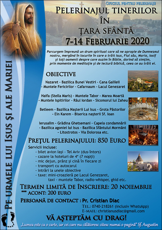 În perioada 7-14 februarie 2020, Oficiul pentru Pelerinaje al Diecezei de Iaşi organizează un pelerinaj pentru tineri în Ţara Sfântă. Programul include toate locurile sfinte care ne vorbesc despre Isus, Maria şi despre lumea Noului Testament.