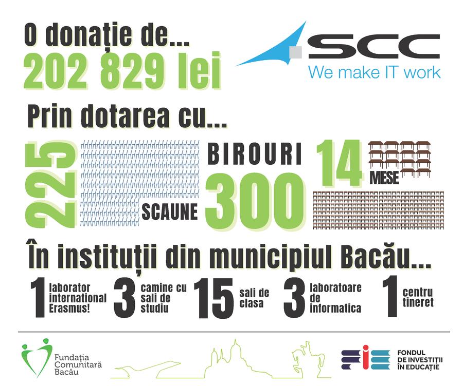 Prin Științescu finanțăm de 5 ani educația științifică STEM. Prin Fondul de Investiții în Educație am administrat o sponsorizare de peste 200 000 lei a SCC Services, prin care am dotat cu mobilier și echipamente un laborator internațional Erasmus, trei cămine cu săli de studiu, trei laboratoare de informatică, 15 săli de clasă și un centru de tineret. În plus, mai avem și un fond de burse pentru elevi și studenți.