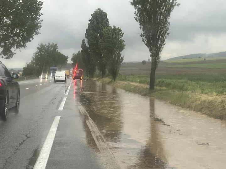 Ploile torențiale din ultimele ore au provocat ieșirea apei pe șosea, transformând acostamentul într-un canal de scurgere improvizat. Zona este semnalizată, iar echipaje de intervenție se află la fața locului.