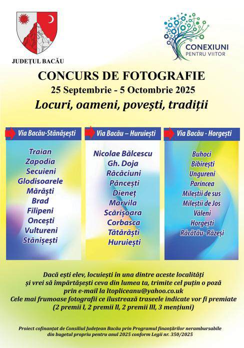 Promovarea personalităților culturale născute în partea estică a județul Bacău și dezvoltarea turismului rural sunt obiectivele principale ale proiectului „BACĂU EST-valori patrimoniale și turism rural”, dezvoltat de Asociatia „Conexiuni pentru viitor”. Proiectul este cofinanțat de Consiliul Județean Bacău prin Programul finanțărilor nerambursabile din bugetul propriu pentru anul 2025, conform Legii nr. 350/2005.