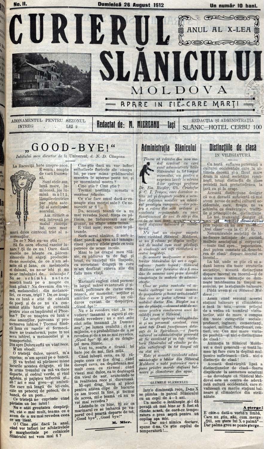 Redactorul-șef, M. Miereanu, pe picior de plecare din stațiunea pe care a îndrăgit-o nespus și în slujba căreia s-a pus cu toată dăruirea și priceperea sa de jurnalist și de înfocat promotor al imaginii Slănicului în lume, mai scrie un ultim editorial al sezonului, încărcat de emoție, nostalgie și speranța revenirii, intitulat ,,Goodbye!”, cu dedicația: ,,Iubitului meu director de la `Universul`, dl N. D. Câmpina”. Ziarul ,,Universul” a fost unul dintre primele cotidiene de informație românești și cel mai citit din România, fiind preluat de Nicolae Dumitrescu Câmpina, în 1904, după decesul jurnalistului italian, Luigi Cazzavillan (survenit în 1903), fondatorul acestui ziar, la 20 august 1884. Pesemne că lui Miereanu, năpădit de amintiri și de tristețea plecării nu-i prea venea somnul (deși făcuse o ultimă plimbare), căci începe să-și aștearnă rândurile, aproape de miezul nopții: ,,La Racoviță bate ora unsprezece. E senin: noapte de vară frumoasă. Sunt stele sus, lună mare, luminoasă; jos, lumină multă, iar lămpile electrice par niște sateliți mai mici ai sateliților soarelui. Am rătăcit o oră întreagă pe malul râulețului, care murmură duios, cântecul trist al amorezilor. De ce? Nici eu nu știu! Să fie oare efectul razelor de lună? Și de ce nu! Oare dacă soarele ne izbește cu pătrunzătoarele lui săgeți producându-ne insolație, de ce n-am admite că și luna, cu melancolia lui duioasă, nu ne-ar izbi și ne-ar îmbolnăvi de… `inlunație`?” Și, după o serie de întrebări și răspunsuri cu tentă filosofică despre efectul razelor de lună asupra stărilor sufletești ale omului, influențat la rându-i de ele, Miereanu, dă frâu liber sentimentelor și tristeților sale, la început mai ușoare, iar apoi, tot mai apăsătoare: ,,Dinspre Dobru suflă un vânt rece. Am obosit. O tristețe dulce, ușoară, m-a cuprins; m-am așezat pe-o bancă. Și va trebui să părăsesc mâine locurile acestea atât de dragi mie, să las în urma trenului ce mă va duce departe, și codrul verde, și râul zglobiu, și pajiștea înflorită, și… oh! – aici e mai greu – și amintirile care mă leagă de câte un petecuț de potecă, de o bancă, de un pom, de un brad… Ce tristețe ne cuprinde când părăsim un loc iubit! Nu e atât de grea despărțirea, cât e mai mult teama pe care o avem de a nu mai revedea ce am lăsat în urmă. O! Cine știe dacă la anul, când vor înflori albăstrelele și margaretele pe colinele Slănicului, noi vom mai fi? Cine știe dacă nu vor înflori sălbaticele floricele ale câmpului, pe care mâna maestrului grădinar le va așterne peste tot, și pe mormântul nostru? Cine știe? Cine știe? Tocmai neștiința asta este `maxima felicitas`. Da, această teamă de a nu mai revedea locul, ființa ce o părăsim, ne îndurerează așa de grozav, ne sfâșâie atât de tare inima… Mi-ești drag, Slănicule, locaș al păcii pentru atâtea clipe de bucurie pe care le-am trăit cu tine… Tocmai de aceea, mi-e teamă că nu te voi mai revedea, căci, cine știe ce se mai poate întâmpla? Și totuși, mai există speranța, cu ea voi trăi până la anul… Lasându-te cu bine, îți spun ca marinarul ce se îmbarcă pe vaporul ce-l poartă departe de tot, `Goodbye, Goodbye!`”