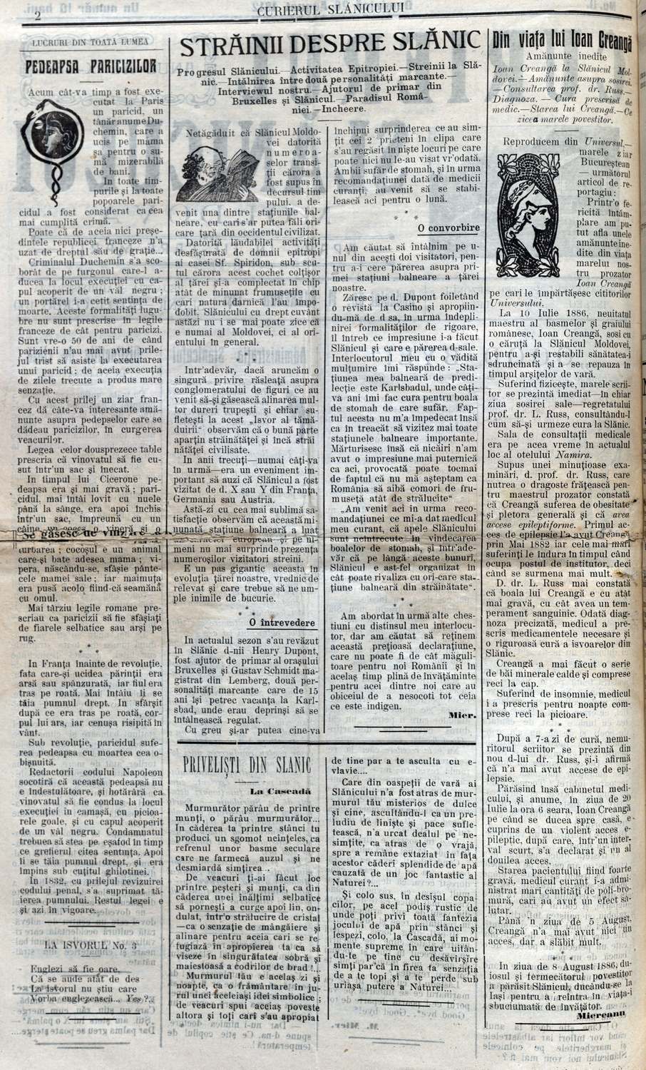 ,,În actualul sezon, s-au revăzut, de această dată la Slănicul-Moldovei, domnii Henry Dupont, fost viceprimar al orașului Bruxelles și Gustav Schmidt, magistrat din localitatea germană, Lemberg, două personalități marcante, care de 15 ani își petrec vacanța la Karlsbad, unde erau deprinși să se întâlnească regulat. Cu greu și-ar fi putut închipui cineva, suprinderea celor doi prieteni, în clipa în care s-au regăsit în niște locuri pe care poate nici nu le-au visat vreodată. Ambii suferă de boli ale stomacului, iar în urma recomandării medicilor curanți, aceștia s-au stabilit aici pentru o lună. Am căutat să întâlnim pe unul dintre acești doi vizitatori, pentru a-i cere părerea despre prima stațiune balneară a țării noastre, Slănicul Moldovei. Îl zăresc pe domnul Dupont foiletând (răsfoind, n. a.) o revistă la Cazinou și apropiindu-mă de domnia-sa, în urma îndeplinirii formalităților de rigoare, îl întreb ce impresie i-a făcut Slănicul și care e părerea dânsului despre cele văzute. Interlocutorul meu, cu o vădită mulțumire, îmi răspunde: `Stațiunea mea balneară, cu predilecție este Karlsbadul, unde de câțiva ani buni îmi fac obișnuita cură pentru boala de stomac de care sufăr. Faptul acesta nu m-a împiedicat însă, ca în treacăt să vizitez mai toate stațiunile balneare importante din Europa. Mărturisesc însă, că nicăieri n-am avut o impresie mai bună și mai puternică așa cum am avut-o aici, provocată poate tocmai de faptul că, nu mă așteptam ca România să aibă comori de frumusețe atât de strălucite. Am venit aici în urma recomandării pe care mi-a dat-o medicul meu curant, potrivit căruia, apele minerale ale Slănicului sunt neîntrecute în vindecarea bolilor de stomac. Și, într-adevăr, că pe lângă aceste bunuri, Slănicul este astfel organizat, încât poate rivaliza cu oricare altă stațiune balneară din străinătate.` Până la final, am abordat și alte chestiuni cu distinsul meu interlocutor, dar am căutat ca această prețioasă declarație să fie reținută, care nu poate fi decât una măgulitoare pentru noi, românii și, în același timp, plină de învățăminte pentru aceia dintre noi, care au obiceiul de a nesocoti tot ceea ce este indigen (adică din propria țară, cf. DEX, n. a.)”.