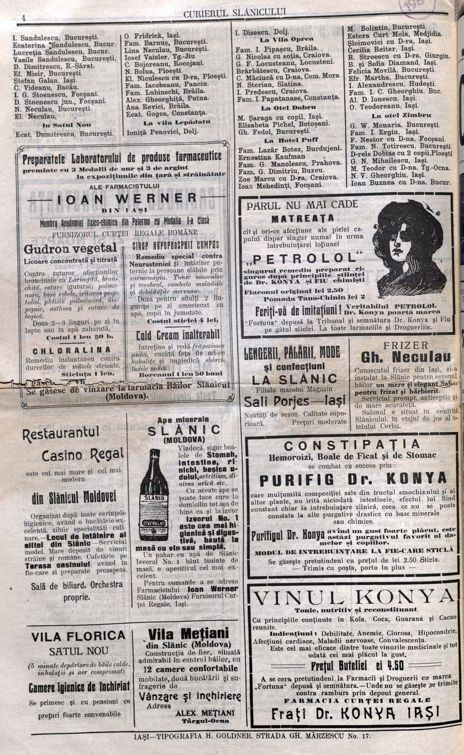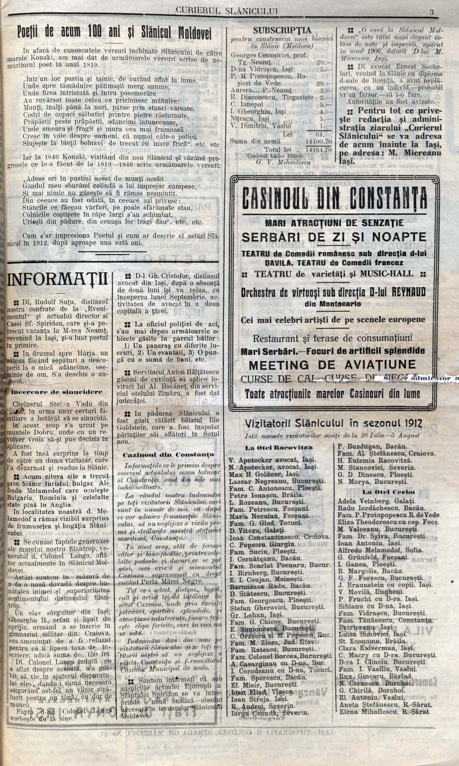 Continuăm prezentarea serialului dedicat ziarului ,,Curierul Slănicului Moldova” (din colecțiile Bibliotecii Centrale Universitare ,,Mihai Eminescu” din Iași și Bibliotecii Centrale Universitare ,,Lucian Balga” din Cluj-Napoca), primul din România care a oglindit viața unei stațiuni balneare și a promovat-o în chip strălucit. În fapt, un jurnal al stațiunii Slănic-Moldova, care acoperă o perioadă istorică mai puțin cunoscută publicului larg, cea din perioada ,,La Belle Époque”; un model peste timp de promovare a turismului balnear al „Perlei Moldovei”, așa cum a fost denumită stațiunea pentru prima dată, chiar de către acest ziar.