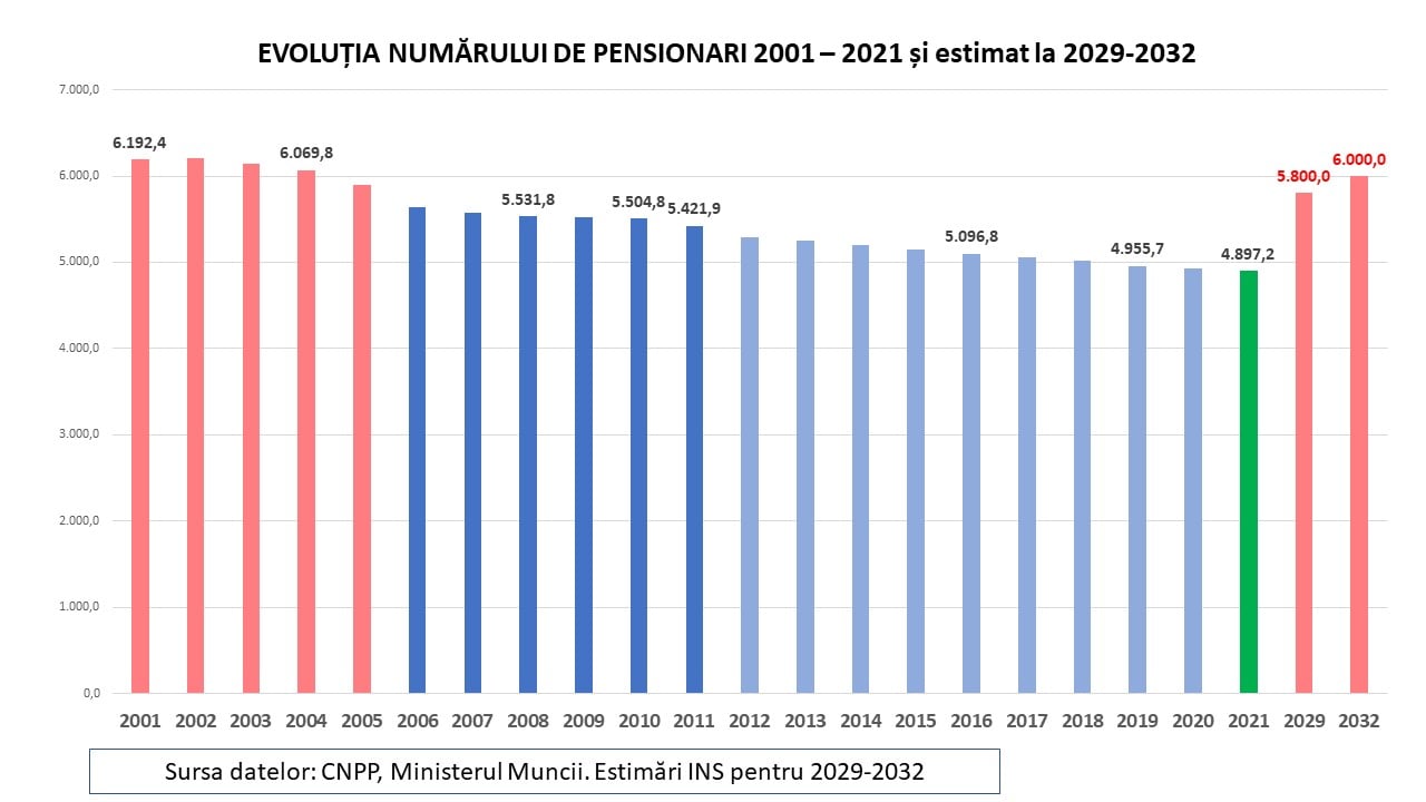 „Știați că România a avut peste 6 milioane de pensionari și nu a dat faliment sistemul? Deși atunci erau sub 4,5 milioane de salariați?”, întreabă retoric economistul Adrian Câciu. El a prezentat un grafic al anilor 2000-2021 și estimarea pentru 2029-2032. „Acum România are doar 4,9 milioane pensionari la aproape 6 milioane de salariați iar guvernanții nu sunt în stare decât să amenințe bătrânii cu sărăcia”, spune Adrian Câciu. Datele sunt publice pe site-ul Ministerului Muncii.