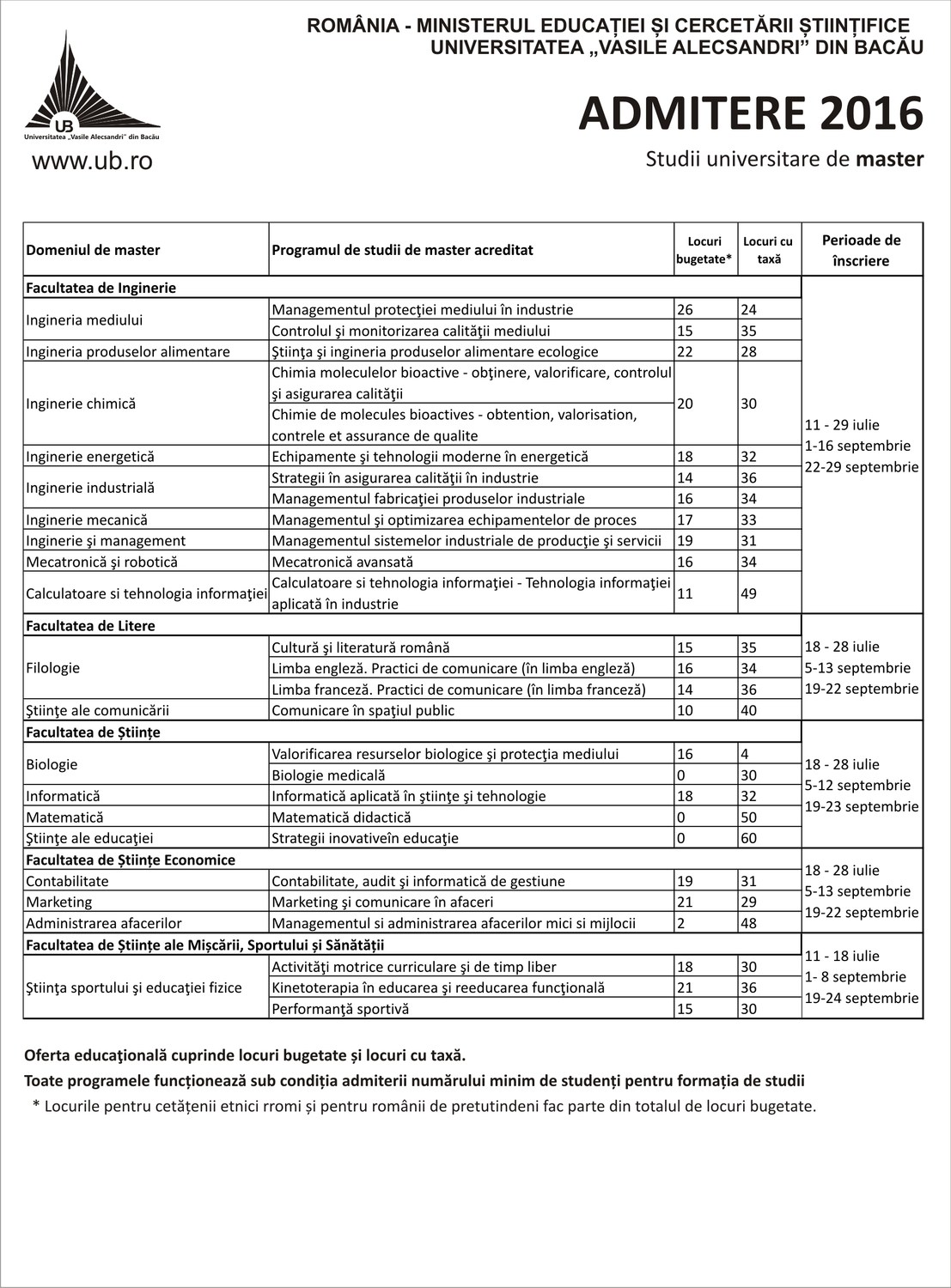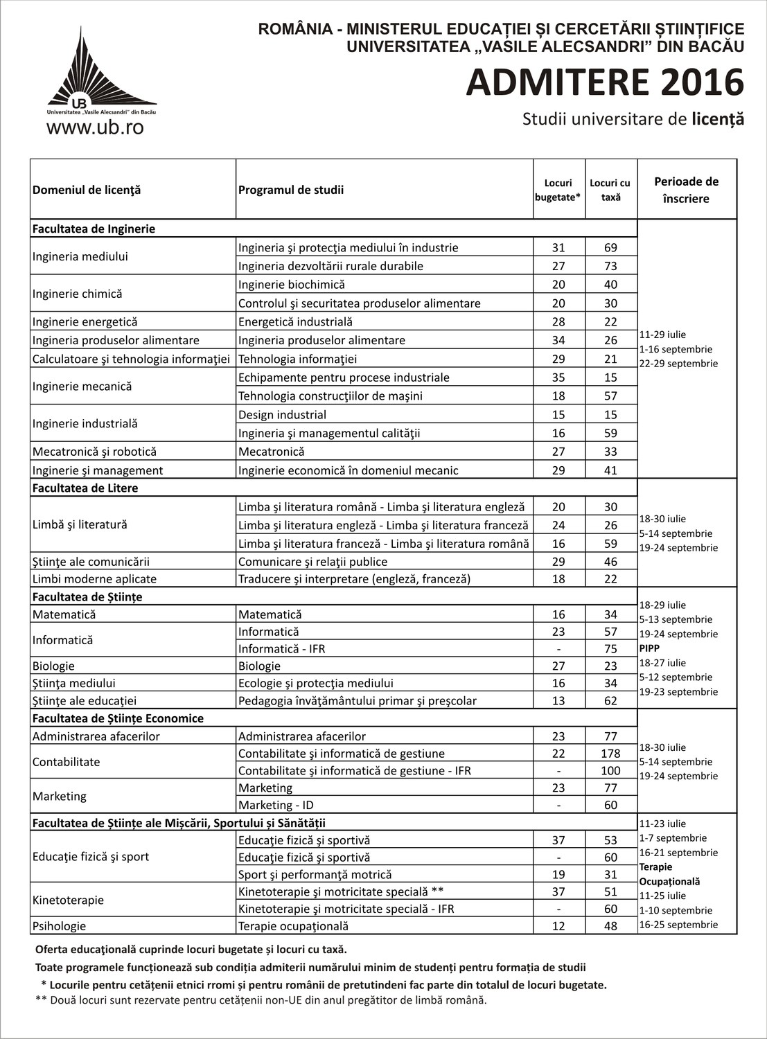 Universitatea „Vasile Alecsandri” din Bacau a inceput admiterea 2016, atât pentru cele 35 de programe de studii universitare de licenta, cât si pentru cele 26 de master. Institutia bacauana de invatamânt superior, cu o istorie de 55 de ani, are in structura cinci facultati: Inginerie, Litere, Stiinte, Stiinte Economice, Stiinte ale Sportului, Miscarii si Sanatatii.