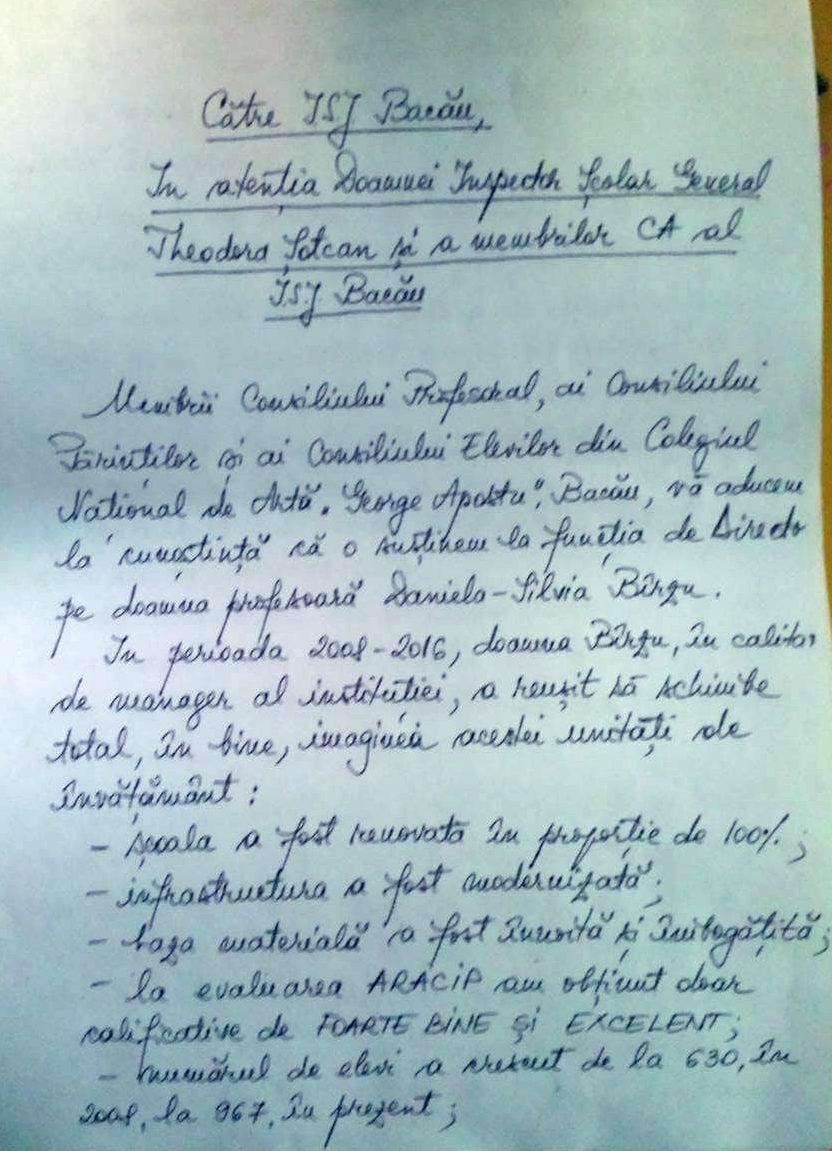 „Profesorii, elevii, părinții lor, foștii elevi și comunitatea de colaboratori ai Colegiului Național Ferdinand I din Bacău, doresc să vă informeze că perspectiva schimbării actualei echipe managerială a colegiului nostru nu este dorită de semnatarii acestei petiții. Având în vedere realizările remarcabile și succesele incontestabile ale școlii în perioada de trei ani în care a fost condusă de actualii directori, doamna profesoară Berza Mirela, director prim și domnul profesor Harasemciuc, director adjunct, ambii profesori de excepție în specialitățile pe care le predau, vă rugăm să reveniți asupra deciziei de a modifica această echipă” – se arata in petitia adresata conducerii ISJ si care are deja 433 de semnaturi.