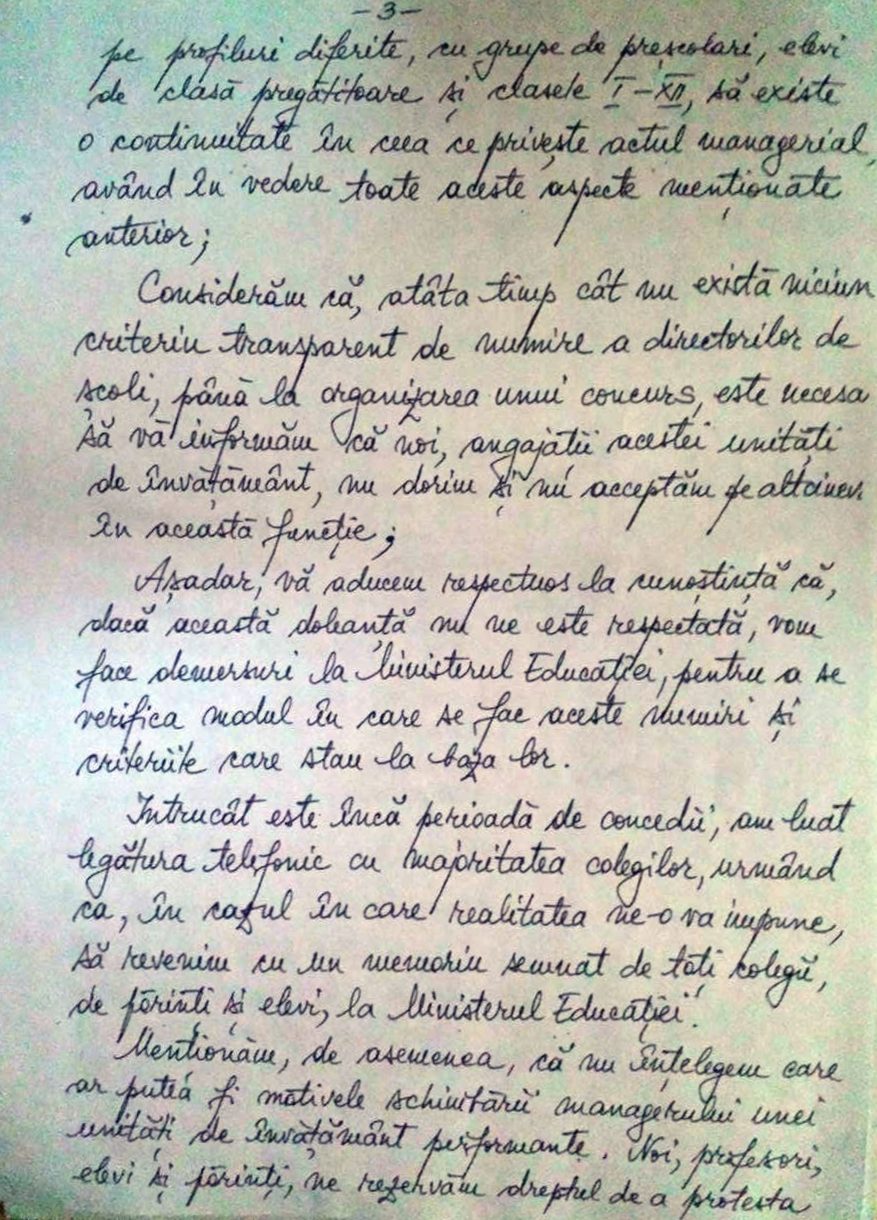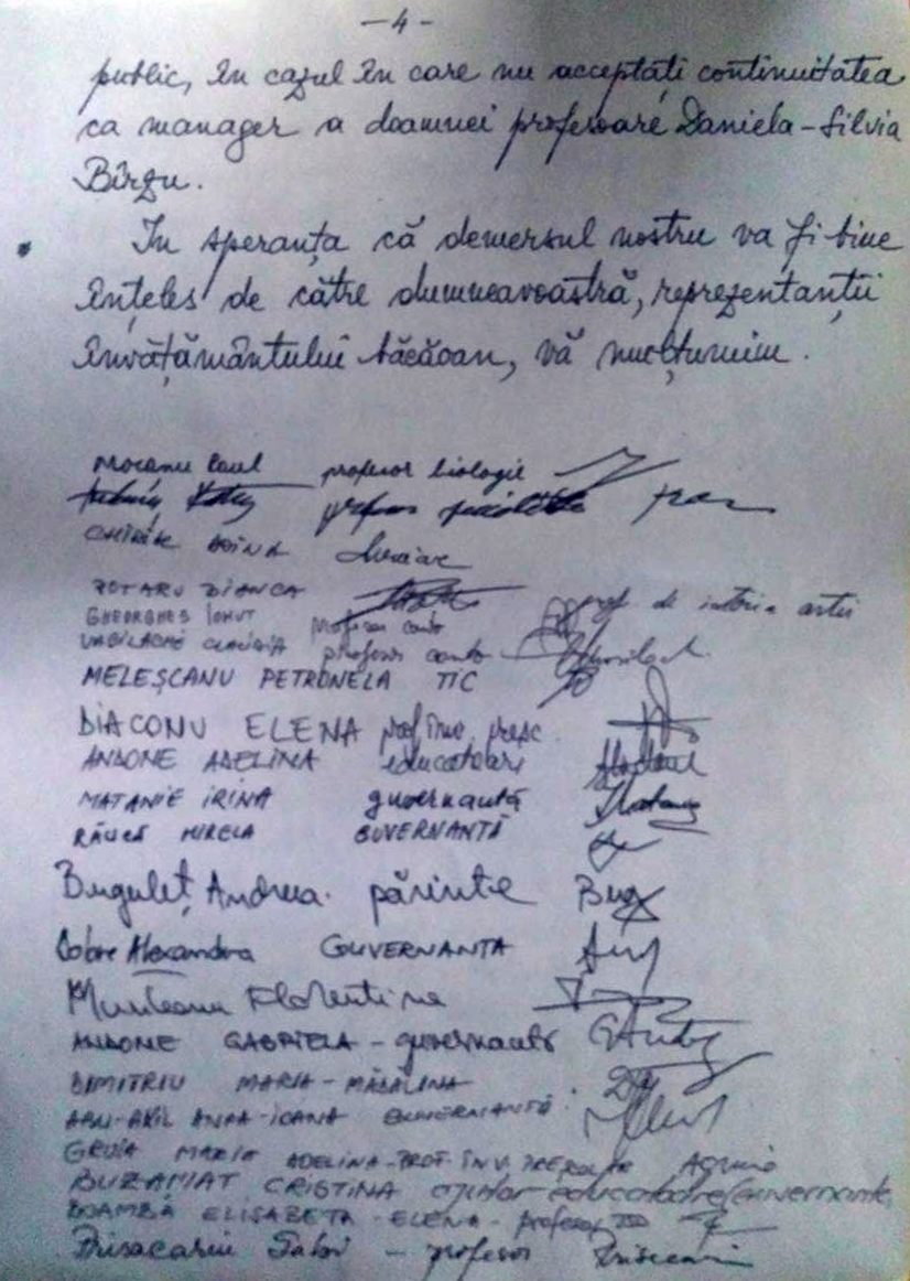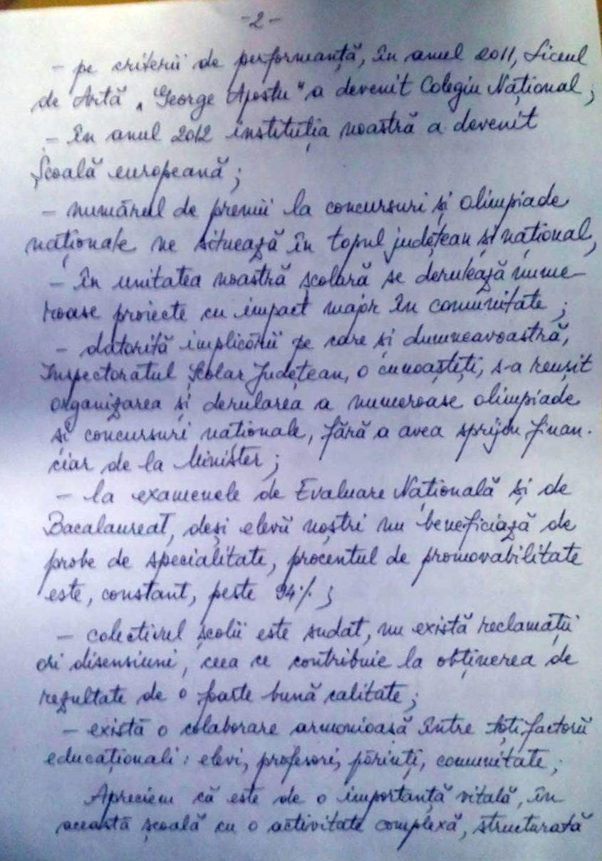 „Membrii Consiliului Profesoral, ai Consiliului Parintilor si ai Consiliului Elevilor din Colegiul National de Arta va aducem la cunostinta ca o sustinem la functia de director pe doamna profesoara Daniela – Silvia Birzu. […] Consideram ca, atata timp cat nu exista un criteriu transparent de numire a directorilor de scoli, pana la organizarea unui concurs este necesar sa va informam ca noi, angajatii acestei unitati de invatamant nu dorim si nu acceptam pe altcineva in aceasta functie. Asadar, va aducem respectuos la cunostinta ca daca aceasta doleanta nu ne este respectata, vom face demersuri la Ministerul Educatiei pentru a se verifica modul in care se fac aceste numiri si criteriile care stau la baza lor”, se arata in petitie.