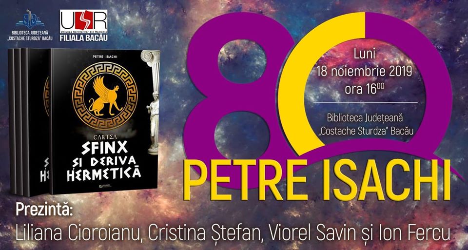 La toate acestea se mai adaugă recenta apariţie „Sfinx şi deriva hermetică”, care va fi lansată luni, 18 noiembrie, ora 16.00, la Biblioteca „Costache Sturdza”. Cartea va fi prezentată de Liliana Cioroianu, Cristina Ştefan, Viorel Savin şi Ion Fercu. Vor mai fi alături de sărbătorit membri ai Filialei Bacău a USR, prieteni şi colegi, redactori şi colaboratori ai Revistei „13 Plus”, al cărui director Petre Isachi este.
