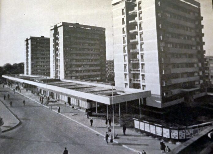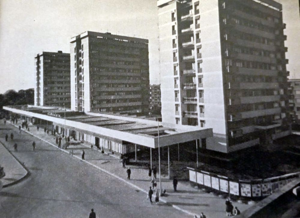 În fața blocurilor turn, vitrinele spațioase și încărcate de mărfuri ale unui complex comercial aduceau un aer de modernitate și prosperitate. Zona devenise un centru vibrant al activității comerciale, cu multiple facilități, inclusiv un cinemascop, un oficiu P.T.T.R., stația de autobuze și taxiuri, toate contribuind la un peisaj urban bine organizat.