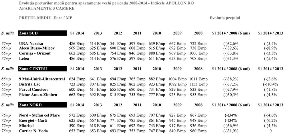Comparativ cu anul 2013, de exemplu, in zona cartierelor Energiei-Gara preturile la apartamentele cu 3 camere s-au mentinut la un nivel relativ stabil pâna in semestrul I din 2014, pretul inregistrând doar o mica scadere de 6,2%. In anul 2013, un apartament de 3 camere (72 mp utili) se vindea cu aproximativ 48.000 de euro, iar in prezent acelasi apartament s-a vândut cu 45.000 de euro.