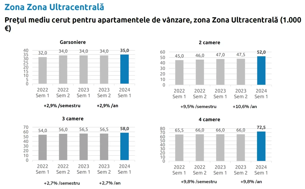 Cea mai semnificativă creștere a fost înregistrată la apartamentele cu 4 camere, unde prețul mediu a crescut de la 65.500 € în semestrul 1 din 2022 la 72.500 € în semestrul 1 din 2024. Aceasta reprezintă o creștere de 9,8% pe semestru și 9,8% pe an, evidențiind o cerere puternică pentru aceste tipuri de locuințe spațioase. Apartamentele cu 4 camere sunt de obicei preferate de familiile extinse sau de cei care caută un confort superior.