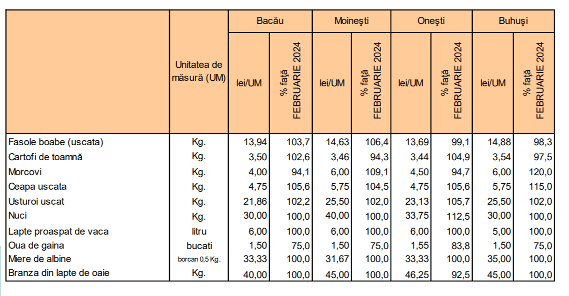 În luna martie 2024, prețurile produselor alimentare din piețele orășenești din județul Bacău au variat semnificativ între localitățile Bacău, Moinești, Onești și Buhuși. Datele colectate de DJS Bacău reflectă diferențe notabile între aceste orașe, atât în ceea ce privește prețurile unitare ale produselor, cât și fluctuațiile procentuale față de luna februarie 2024.