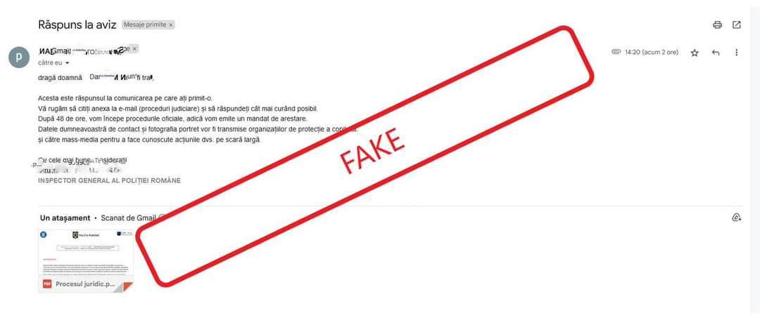 Un alt semn al faptului că aceste e-mailuri transmise, sunt tentative de fraude on-line este faptul că, mesajul conține greșeli de scriere sau gramaticale, denumiri neactualizate ale ministerelor sau inexistente ale unor structure din cadrul Poliției Române.
