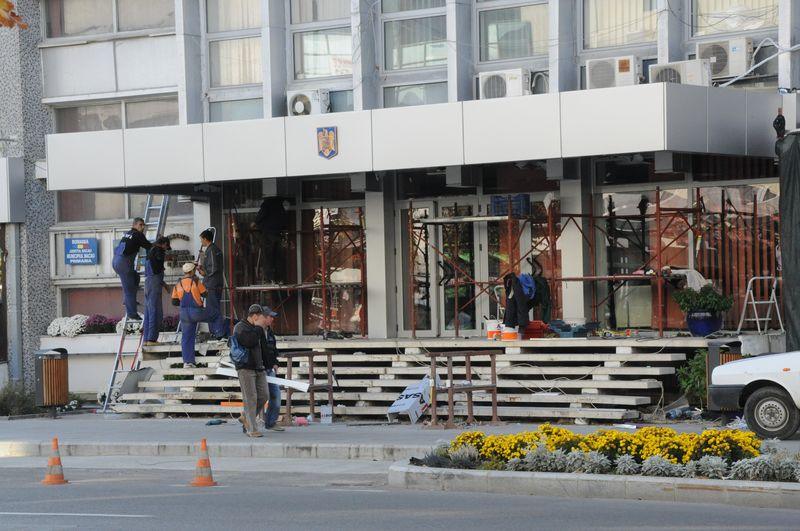 Timp de doua saptamani la intrarea in Primaria Bacau s-au instalat schele iar muncitorii s-au apucat de spart, de sapat si reconstruit. Lucrarile nu s-au extins la fatada primariei, asa cum era prevazut initial, ci s-au limitat doar la copertina de la intrare si la pod. „Cladirea primariei prezinta grad seismic ridicat”, explica Ionut Tomescu, purtator de cuvant al institutiei. „S-au executat lucrari de refacere a aticului (decopertare, hidroizolatie, învelit exteriorul, îndepartat betonul care îngreunat întreaga structura). Ca urmare a infiltratiilor, lucrarile de hidroizolatie s-au efectuat si pe acoperisul Compartimentului de Informare Cetateni”. Pentru aceste lucrari, municipalitatea nu a facut o licitatie, ci a preferat sa incredinteze direct contractul unei firme. „Valoarea estimata a lucrarilor este de 45.000 lei, iar executantul este SC Iuvenis SRL”, a mai precizat Tomescu. Societatea are sediul in Saucesti si a fost deschisa in 2004, in domeniul constructii de cladiri. In 2011 a raportat o cifra de afaceri de peste 868 de mii de lei, cu doar doi angajati.