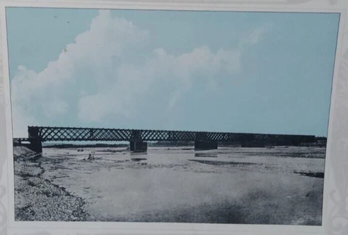 Podul de lemn de 200 de metri peste râul Bistrița, parte a liniei de cale ferată Bacău–Piatra Neamț, într-o ilustrație din anul 1903. Această realizare inginerească reprezenta la vremea respectivă un pas important în dezvoltarea infrastructurii feroviare din regiunea Moldovei, conectând două centre economice și culturale importante.