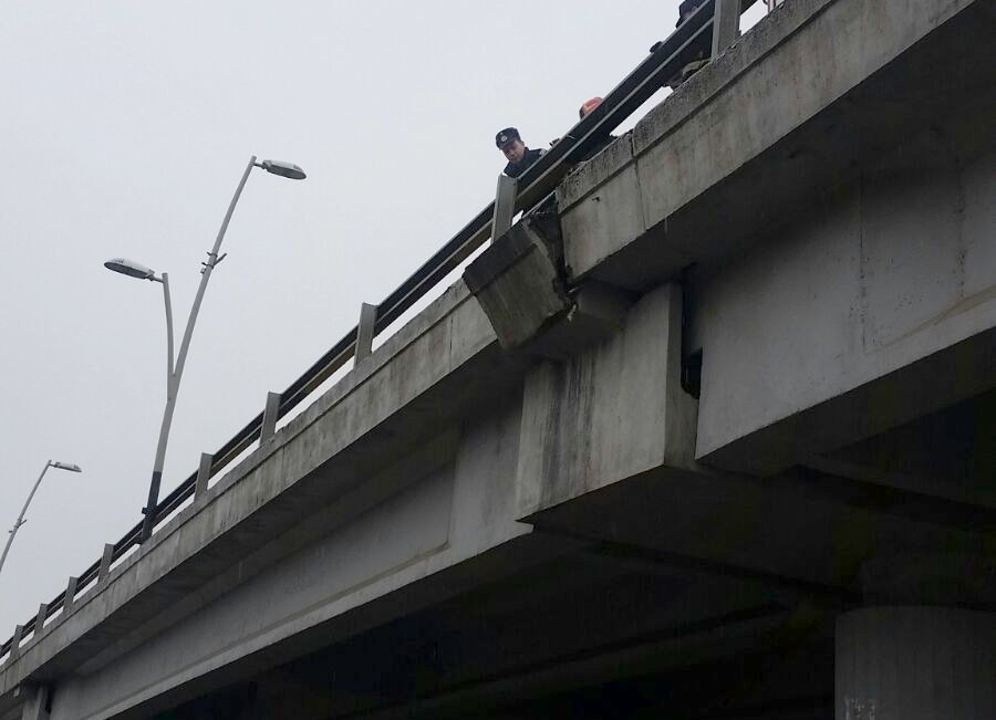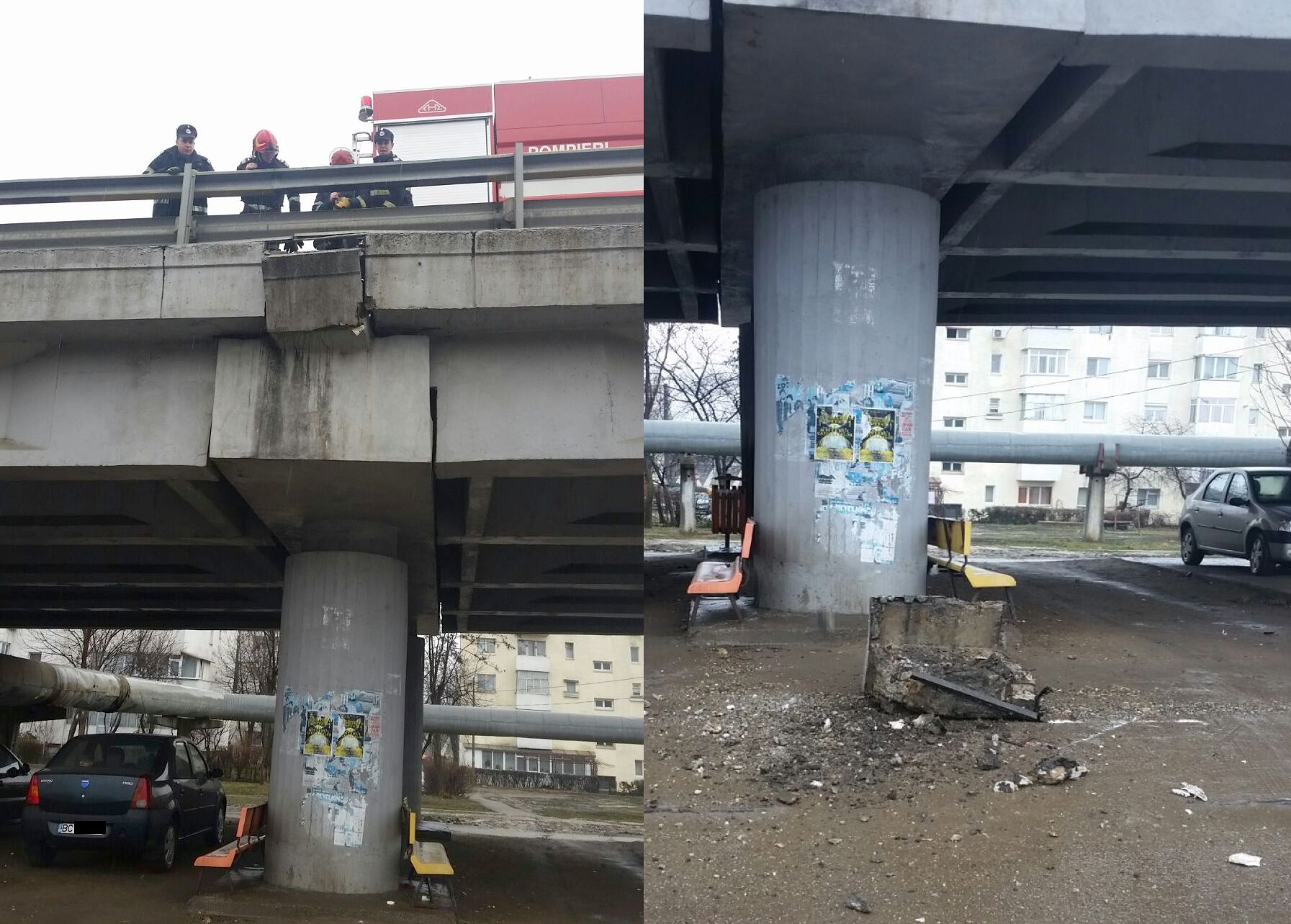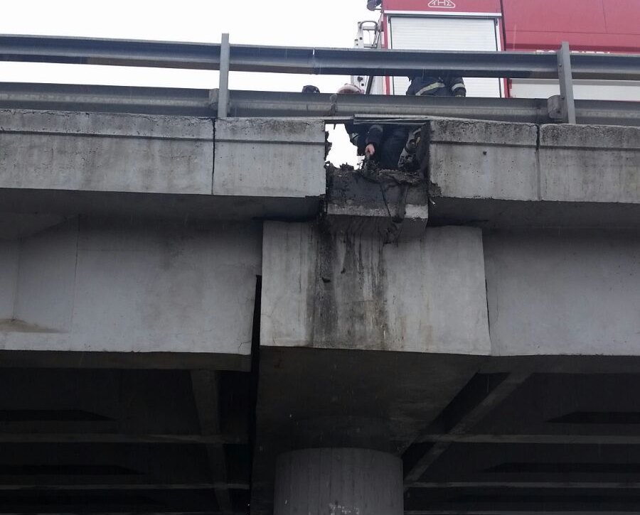 Pompierii au desprins blocul de beton, care s-a dezintegrat la impactul cu asfaltul șoselei de sub pod. Intervenția a durat circa 20 de minute, însă s-ar putea să nu fie ultima, având în vedere vechimea podului, construit în 1964.