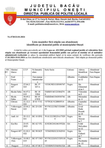 Pe o listă extinsă a autovehiculelor abandonate sau fără stăpân identificate pe străzile municipiului Onesti, Poliția Locală a subliniat necesitatea preluării acestora într-un termen rezonabil. Persoanele care figurează ca proprietari sau deținători legali ai vehiculelor respective sunt rugate să acționeze prompt pentru a evita sancțiunile.