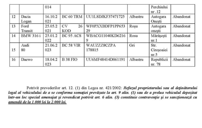 Pe o listă extinsă a autovehiculelor abandonate sau fără stăpân identificate pe străzile municipiului Onesti, Poliția Locală a subliniat necesitatea preluării acestora într-un termen rezonabil. Persoanele care figurează ca proprietari sau deținători legali ai vehiculelor respective sunt rugate să acționeze prompt pentru a evita sancțiunile.