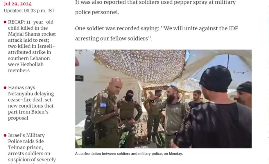 Soldații israelieni ar fi confruntat poliția și s-au baricadat, folosind spray-uri cu piper împotriva personalului militar sosit pentru a reține suspecții, iar protestatarii au pătruns în centrul de detenție. Sursele au spus că soldații au fost reținuți din cauza rapoartelor că au abuzat un prizonier palestinian.