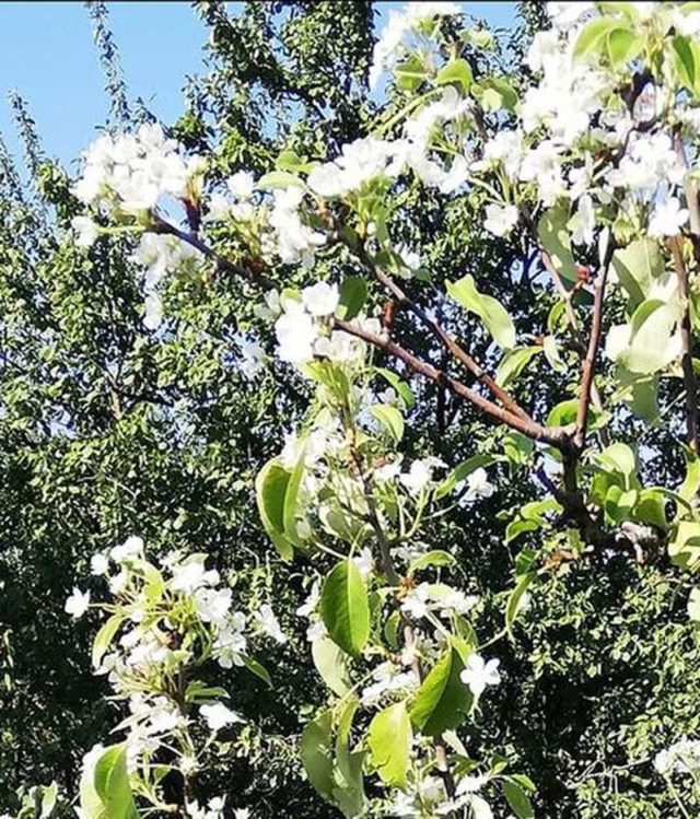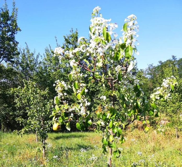 Se întâmplă peste tot prin satul Fofaza, aparținând comunei Corbasca. De exemplu, un păr a înlorit în întregime, în același timp când o pară aurie așteaptă să fie culeasă de proprietarul pomului fructifer.
