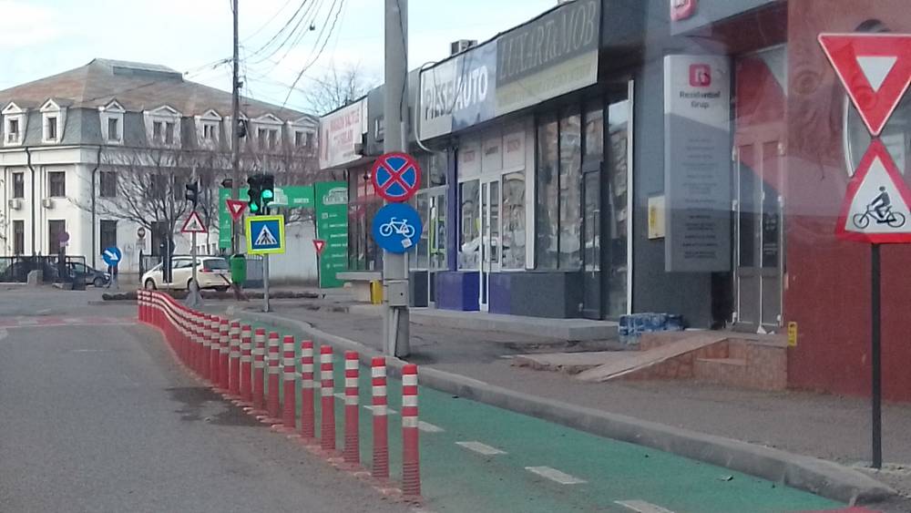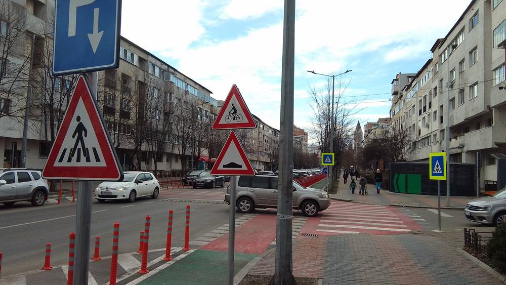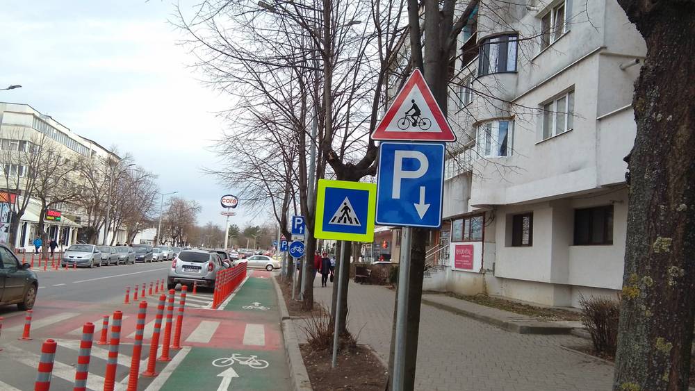Totodată, indicatorul „Atenție denivelări,” destinat șoferilor în preajma trecerilor de pietoni, pentru a semnaliza celebrele „cocoașe”, pare să-și găsească confortul tot pe marginea pistei destinate bicicliștilor.