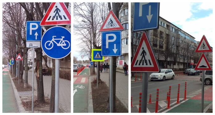 Pe pistele de bicicletă din Bacău au înflorit o sumedenie de semne de circulație. Sunt atât de multe încât cei care le-au amplasat au trebuit să pună si câte două pe un stâlp.