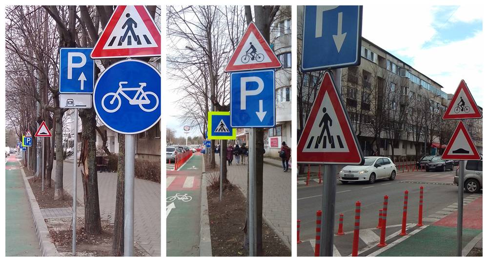 Totodată, indicatorul „Atenție denivelări,” destinat șoferilor în preajma trecerilor de pietoni, pentru a semnaliza celebrele „cocoașe”, pare să-și găsească confortul tot pe marginea pistei destinate bicicliștilor.