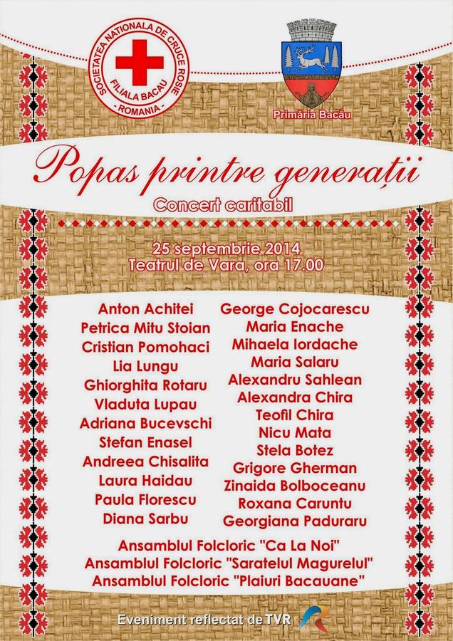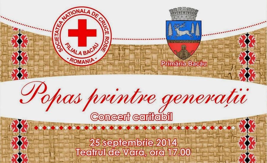 Societatea Națională de Cruce Roșie din România, Filiala Bacău, va fi beneficiara unui spectacol de caritate, desfășurat în data de 25 septembrie a.c. sub titulatura POPAS ÎNTRE GENERAȚII, la Teatrul de Vara “Radu Beligan”, începând cu ora 17.00.