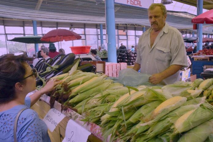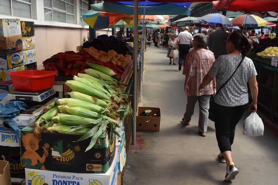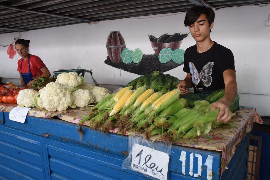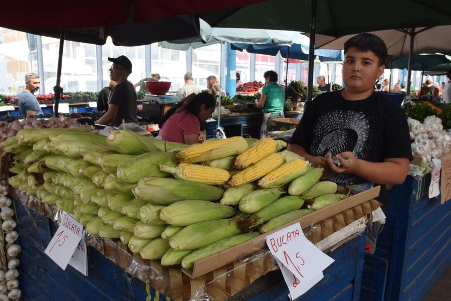 În Piața Centrală, Nea Radu a mai scăzut prețul față de luni. Are porumb la vânzare, pe 3 categorii, de la 1 leu, 1,50, la 2 lei. Știuleți locali, de grădină, dar și din cei dulci, modificați, cu bobul mai moale, pentru danturi mai șubrede. A ieșit la pensie după 45 de ani de muncă. Nu ajunge. În felul acesta mai adună un ban. E nemulțumit însă de faptul că producția din acest an, datorită secetei, nu mai este de aceași calitate. La o altă tarabă, o altă ofertă.