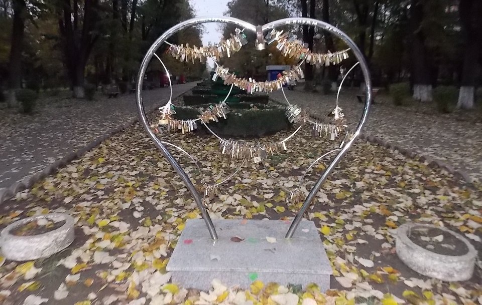 Parcul era pustiu si doar zgomotul facut de o masina a celor de la Directia de Servicii Publice a spart linistea de pe aleile intunecate, presarate de frunze. Privirea mi s-a oprit pe multitudinea de lacate agatate de inima de inox. Fiecare bucata de metal era insufletita de câte un mesaj sau de o panglica colorata, menite sa atraga atentia, sa le faca cât mai vizibile.