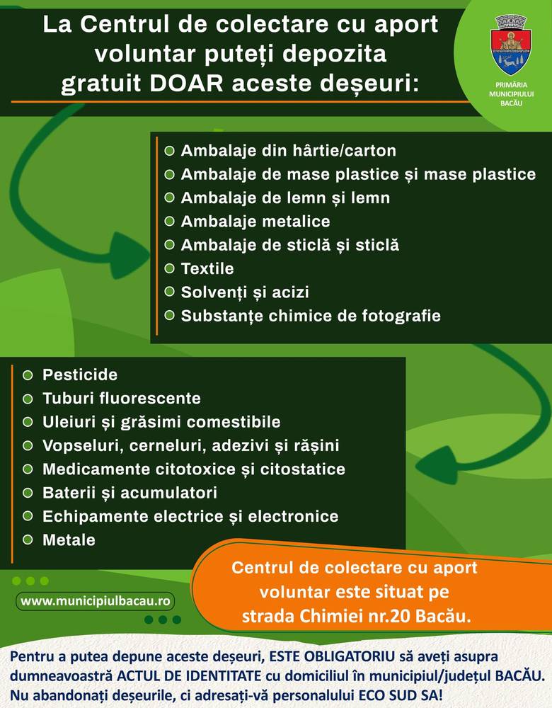 Primarul municipiului Bacău, Lucian Daniel Stanciu Viziteu, a venit cu o serie de clarificări privind funcționarea Centrului de Colectare cu Aport Voluntar (CAV), situat pe strada Chimiei nr. 20. Acesta a răspuns la întrebările și sesizările venite din partea cetățenilor referitoare la modul în care pot utiliza acest serviciu gratuit.