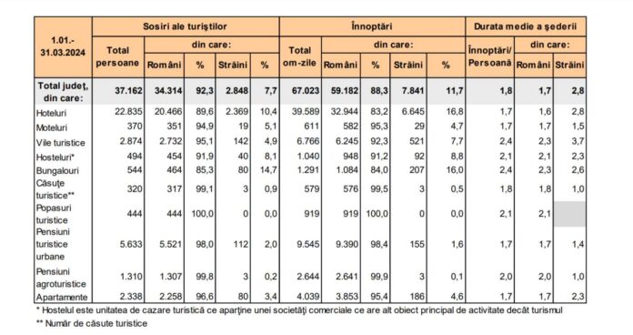 - Bungalouri: Acestea au înregistrat un procent semnificativ de turiști străini (14,7%), cu un total de 80 de sosiri.