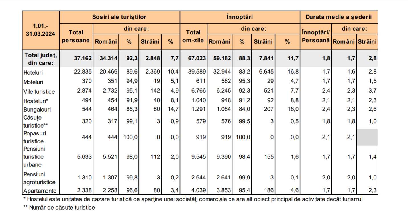 - Hoteluri: Hotelurile au fost preferate de majoritatea turiștilor români, înregistrând 20.466 de sosiri (89,6% din totalul sosirilor la hoteluri).