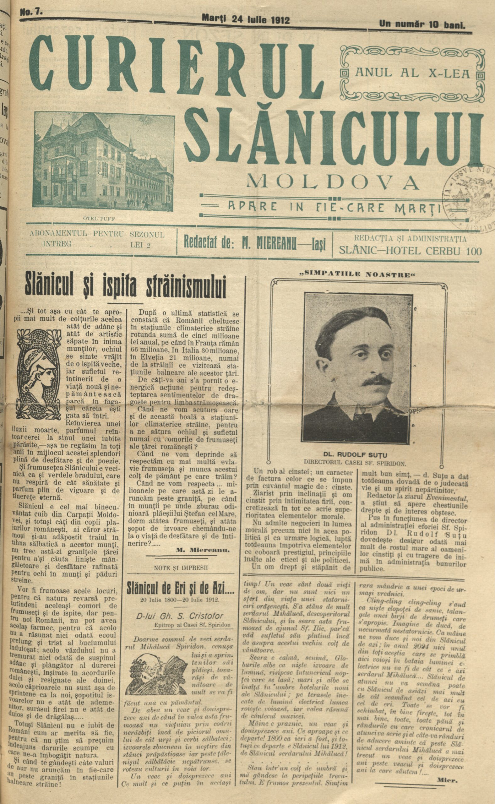 Un gest colegial, normal pe-atunci pentru breasla gazetarilor, îl face din nou redactorul-șef M. Miereanu, care schițează, de această dată, un portret al lui Rudolf Șuțu, redactor-șef și mai apoi, director al cotidianului ieșean ,,Evenimentul”, director al Casei ,,Sf. Spiridon” din Iași, unul dintre vizitatorii Slănicului: ,,Un caracter de factura celor ce se impun prin cuvântul magic: cinste. Ziarist prin înclinații și om cinstit prin intimitatea firii, concretizează, prin tot ceea ce scrie, superioritatea elementelor morale. Nu admite negocieri în lumea morală, nici în cea politică și, ca urmare logică, luptă întotdeauna, împotriva elementelor ce coboară prestigiul, principiile înalte ale eticii și politicii. Ca redactor la ziarul `Evenimentul`, a știut să apere chestiunile drepte și de interes obștesc. Pus în funcția de director al Administrației Eforiei `Sf. Spiridon`, dl Rudolf Șuțu, dovedește, cu atât mai mult, rostul mare al oamenilor cinstiți și cu tragere de inimă în administrarea bunurilor publice”.