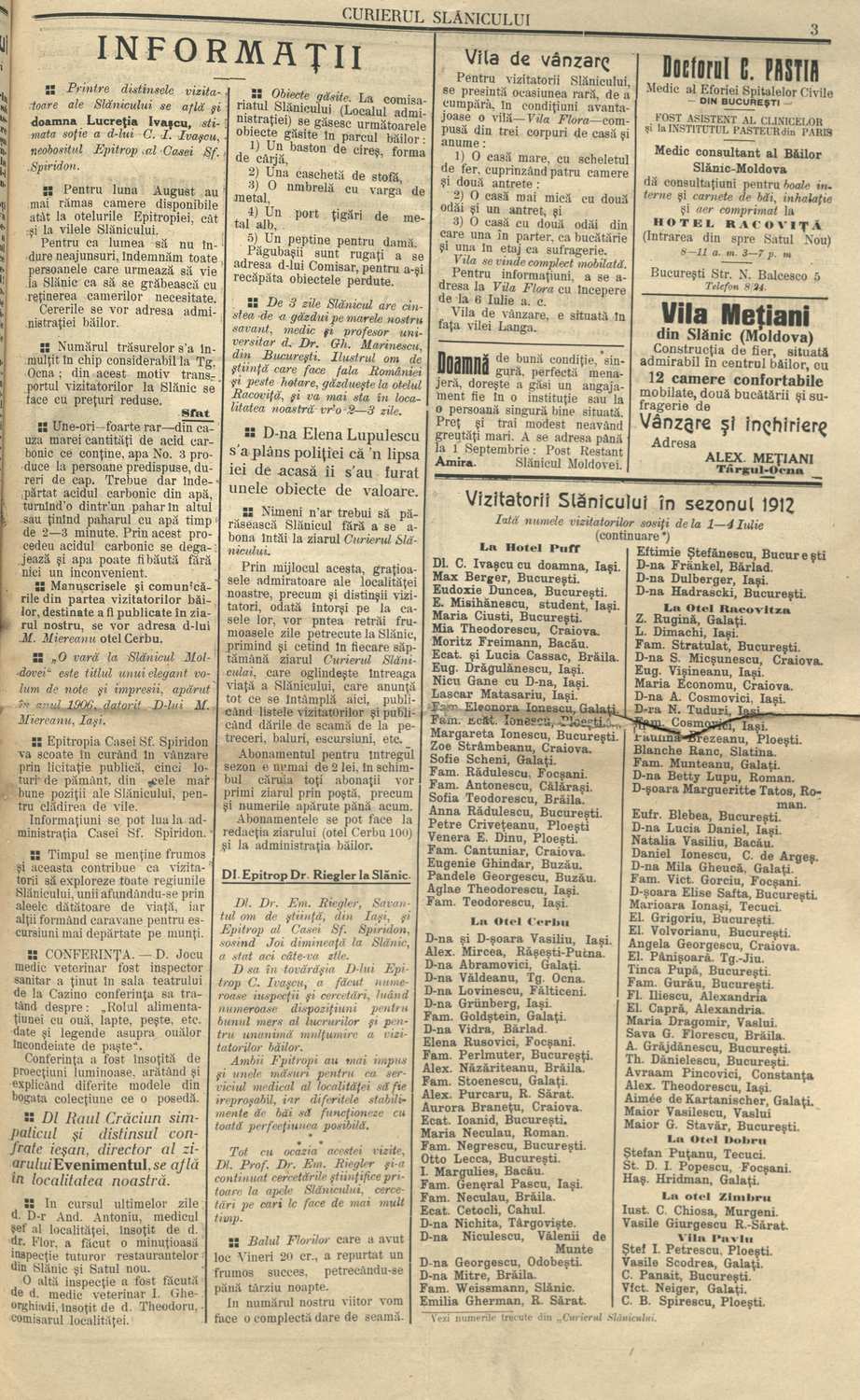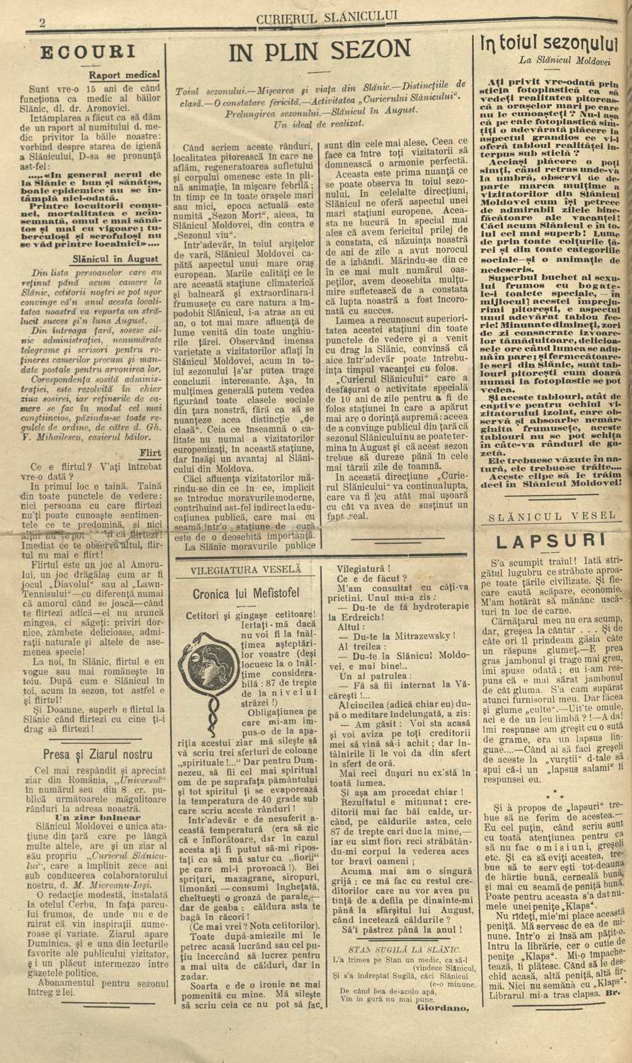 Continuăm prezentarea serialului dedicat ziarului ,,Curierul Slănicului Moldova” (din colecțiile Bibliotecii Centrale Universitare ,,Mihai Eminescu” din Iași și Bibliotecii Centrale Universitare ,,Lucian Balga” din Cluj-Napoca), primul din România care a oglindit viața unei stațiuni balneare și a promovat-o în chip strălucit. În fapt, un jurnal al stațiunii Slănic-Moldova, care acoperă o perioadă istorică mai puțin cunoscută publicului larg, cea din perioada ,,La Belle Époque”; un model peste timp de promovare a turismului balnear al „Perlei Moldovei”, așa cum a fost denumită stațiunea pentru prima dată, chiar de către acest ziar.