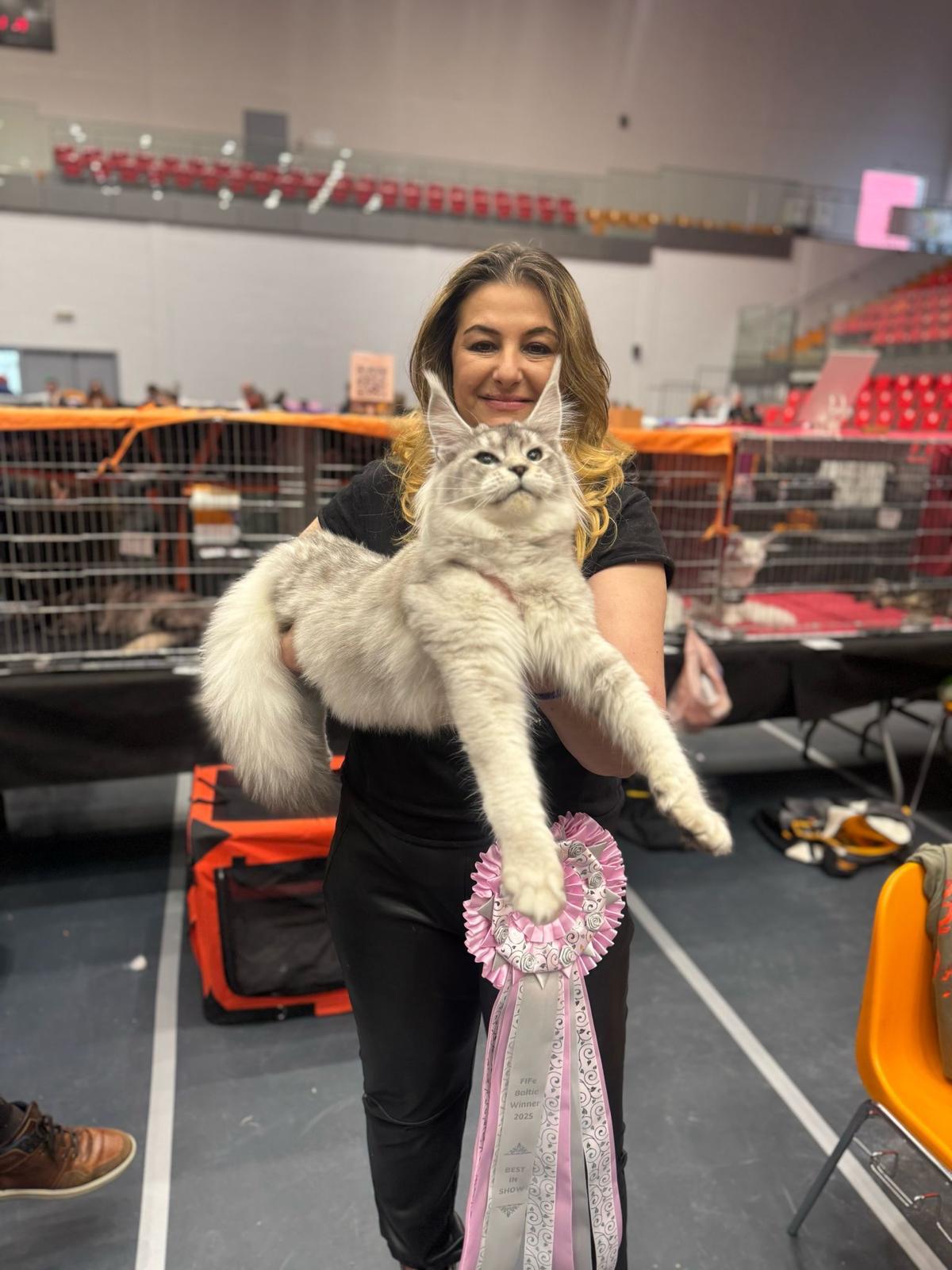 Gina’s Drea IARA, o spectaculoasă femelă Maine Coon Silver – Baltic Winner, cu performanțe notabile la Campionatul Mondial 2024, crescută de Gina Vlad.