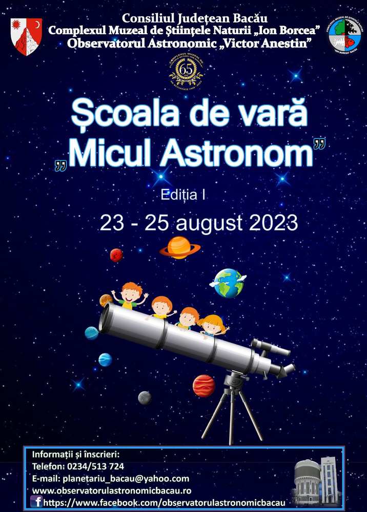 Întrucât proiectele lansate deja, care se referă la produsele culturale „Şcoli de Vară” se bucură de un mare succes, Complexul Muzeal de Ştiinţele Naturii „Ion Borcea” Bacău organizează, la cererea publicului, la subunitatea Observatorul Astronomic „Victor Anestin”, o nouă Școală de vară, intitulată: „MICUL ASTRONOM”, care se va desfășura în perioada 23 – 25 august 2023. Activitățile din cadrul Școlii de vară au fost gândite special pentru copii cu vârste cuprinse între 6 și 12 ani şi va avea următorul program: