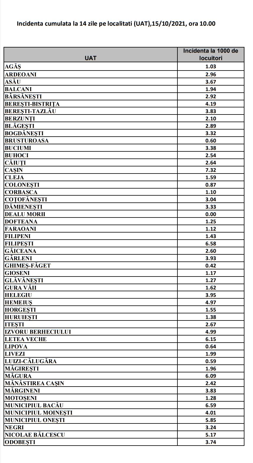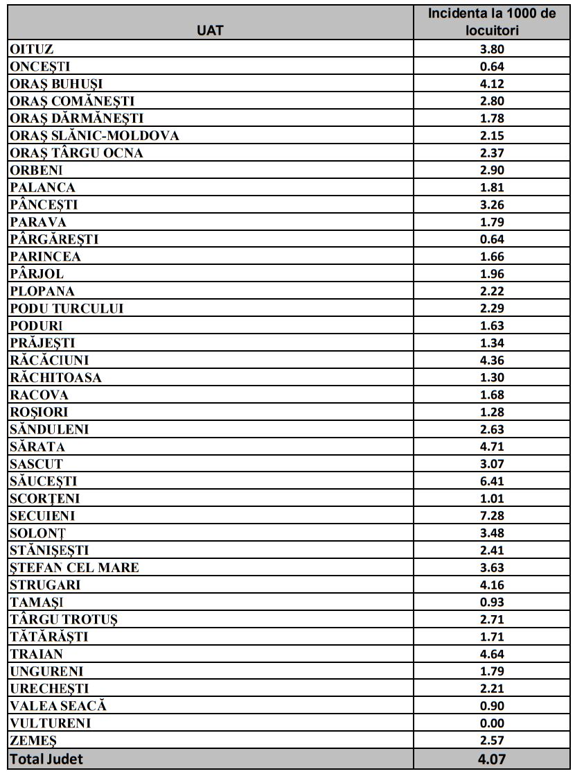 La Onești rata de incidență a crescut la 5,85 la mie de la 5,59.