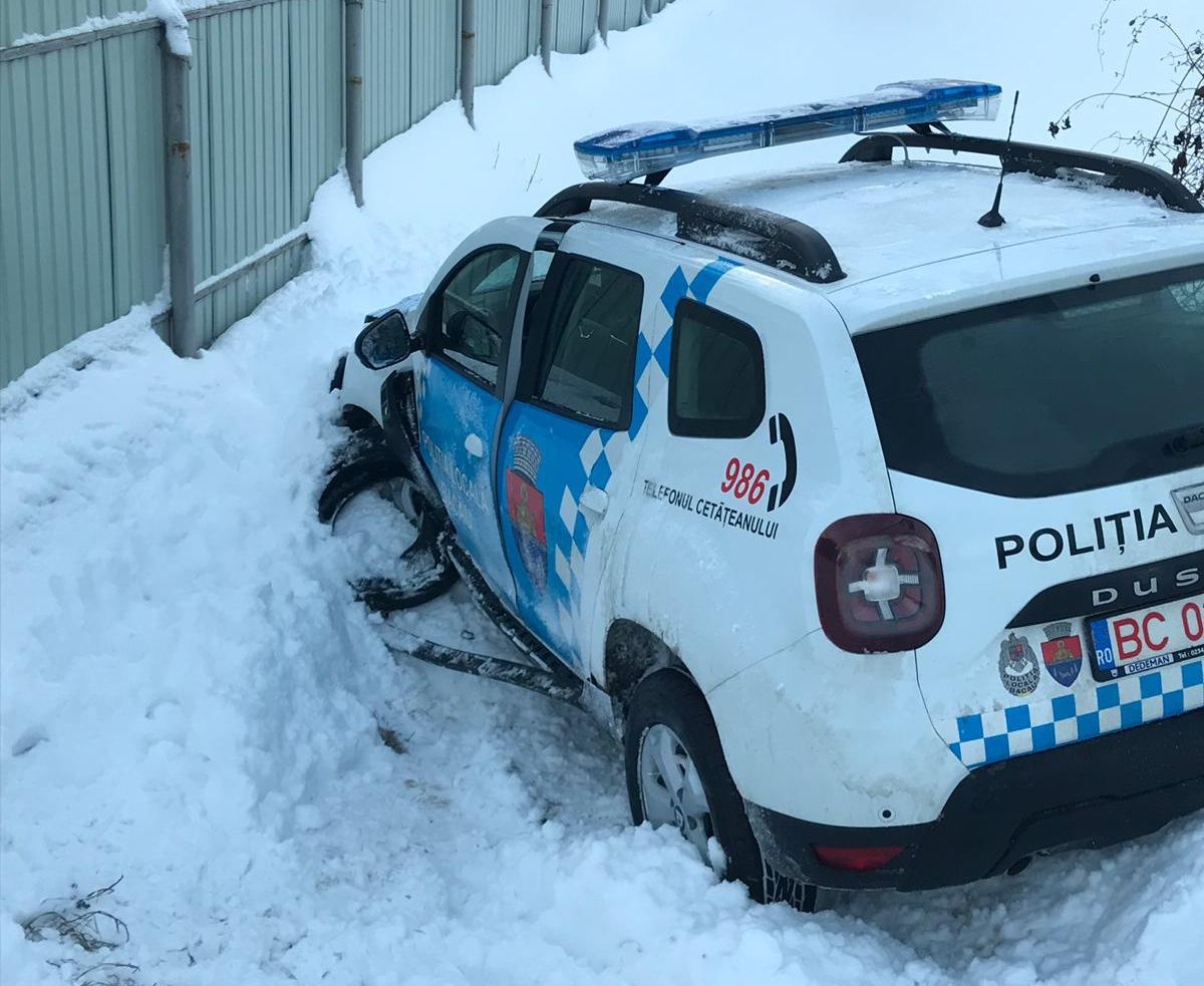 Un Duster al Poliției locale a municipiului Bacău a fost implicată, sâmbătă, într-un accident rutier, la ieșirea din oraș spre Mărgineni.