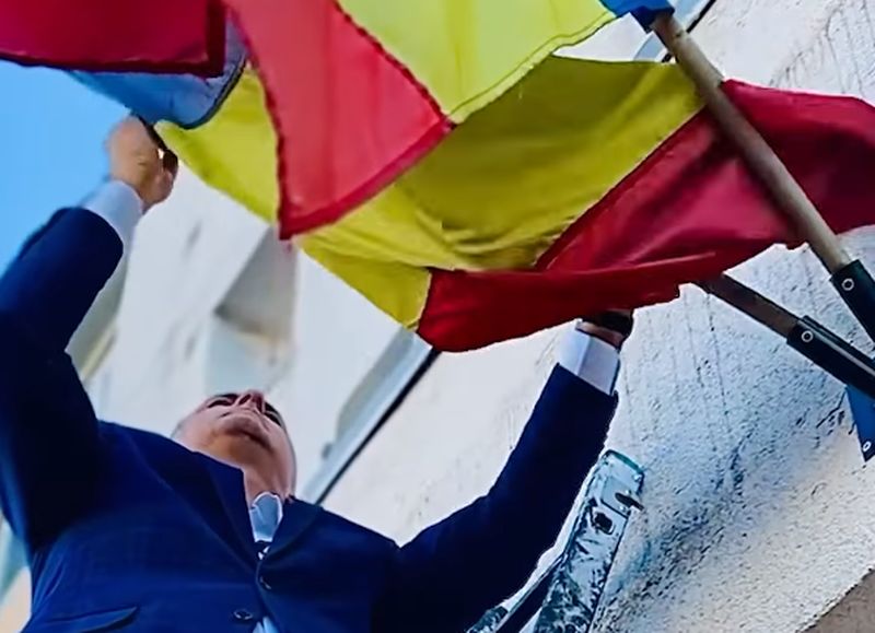 Astăzi dimineață, primarul municipiului Bacău s-a urcat pe o scară pentru a aranja drapelul României ce flutura deasupra unui sediu de partid din oraș.