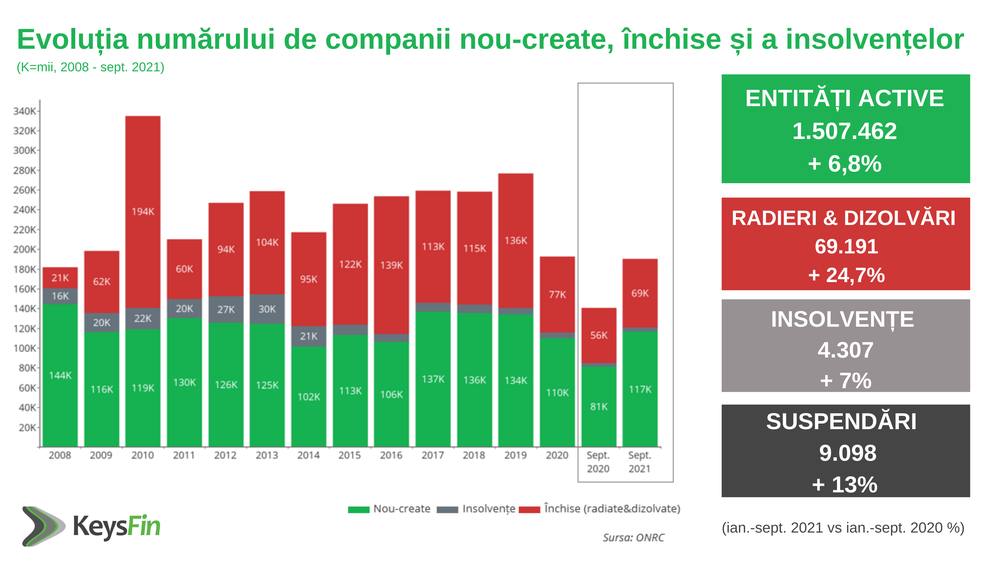Bilanțul primelor 9 luni ale anului 2021 arată că numărul companiilor noi a crescut cu 44%, dar totodată s-au înregistrat mai multe insolvențe, suspendări, radieri și dizolvări comparativ cu aceeași perioadă a anului 2020, potrivit analiștilor Keysfin.