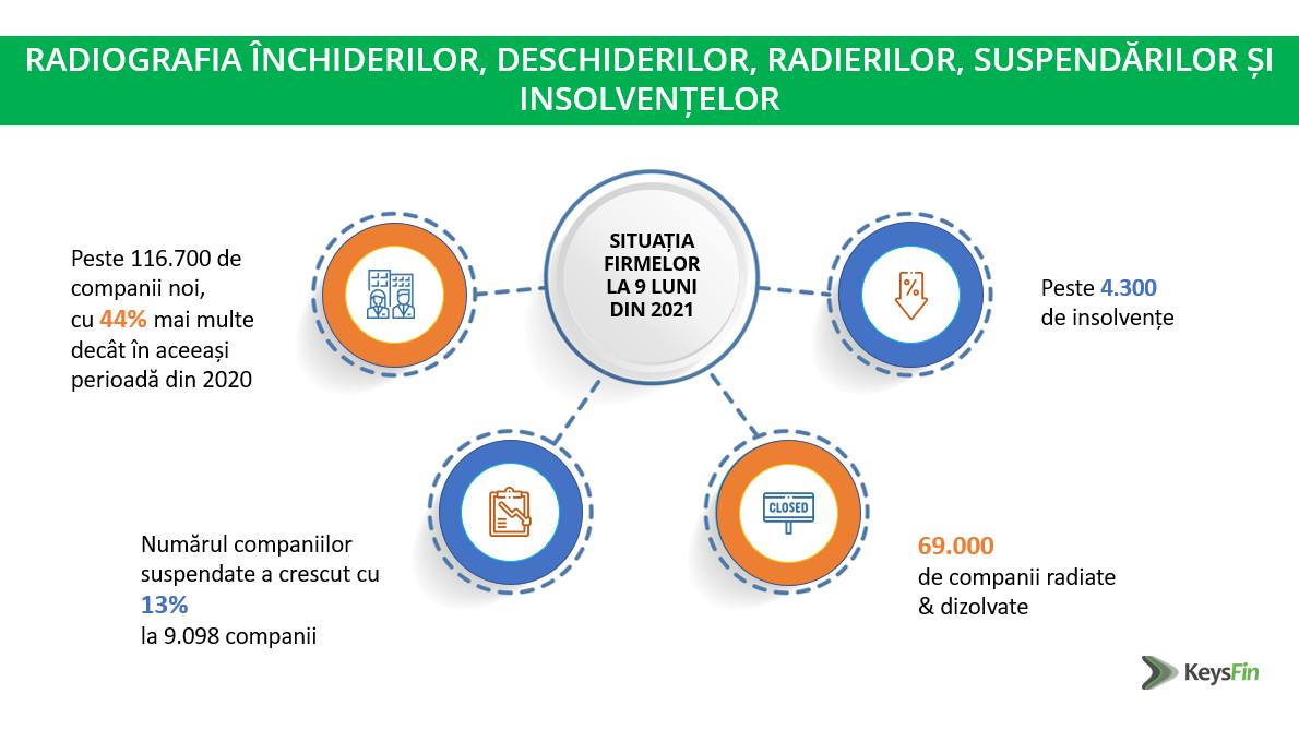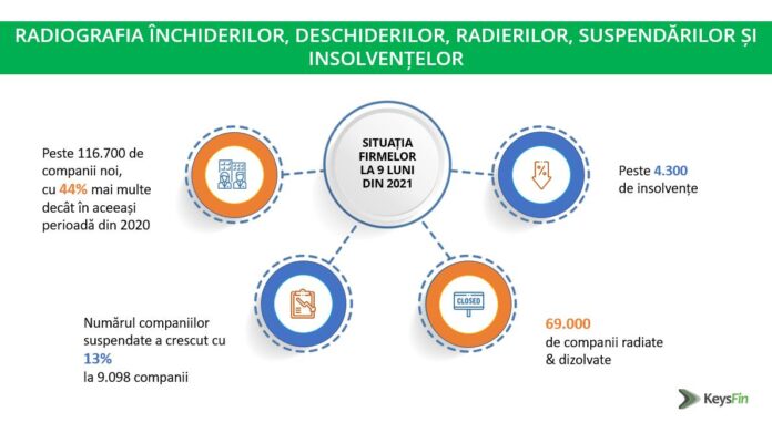 Bilanțul primelor 9 luni ale anului 2021 arată că numărul companiilor noi a crescut cu 44%, dar totodată s-au înregistrat mai multe insolvențe, suspendări, radieri și dizolvări comparativ cu aceeași perioadă a anului 2020, potrivit analiștilor Keysfin.